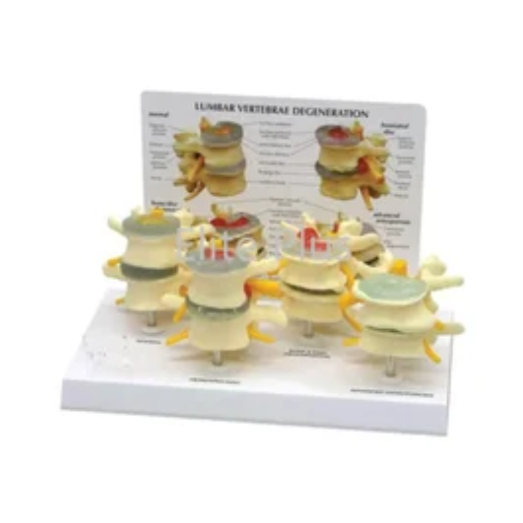 Stages Of Lumbar Degeneration Model is a set of four, full size two-piece vertebrae models. It features one each of the following conditions:normal, OE bulging, herniated disc, bone and disc degeneration, and advanced osteoporosis with marked bone compression and bone spurs.