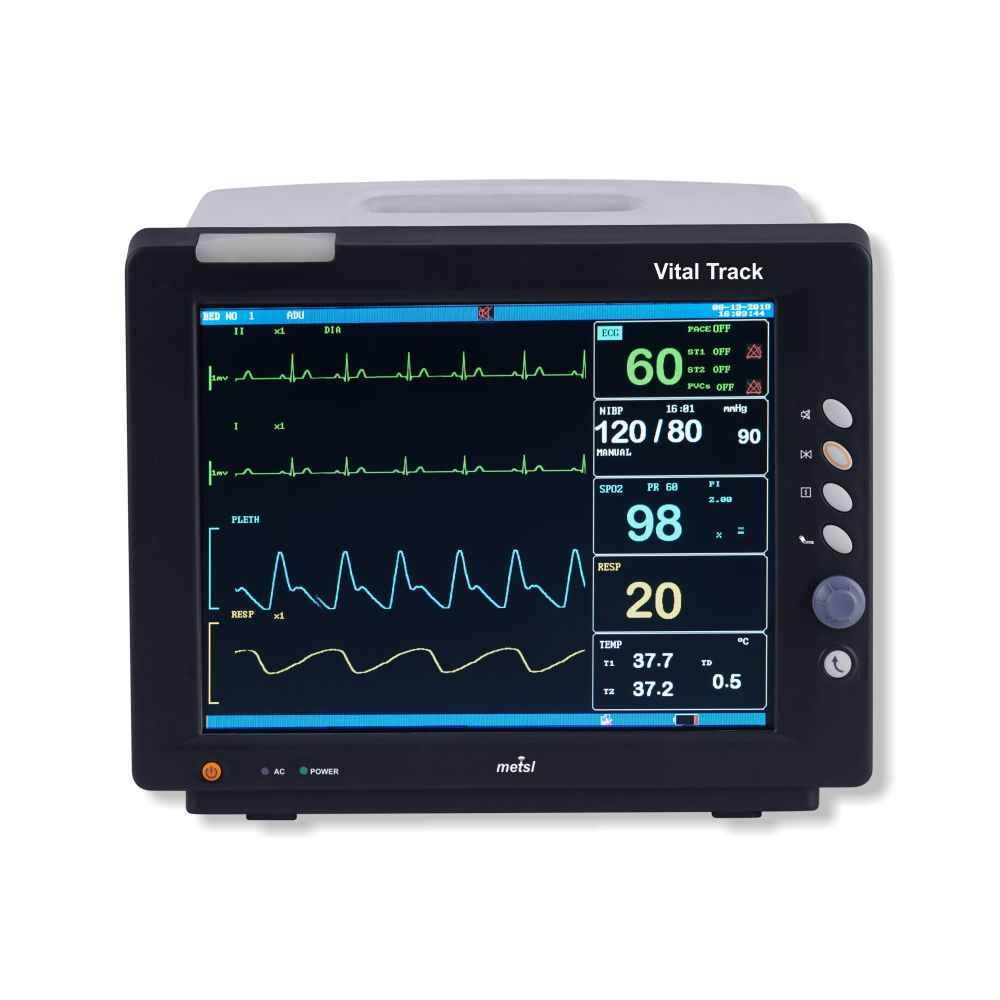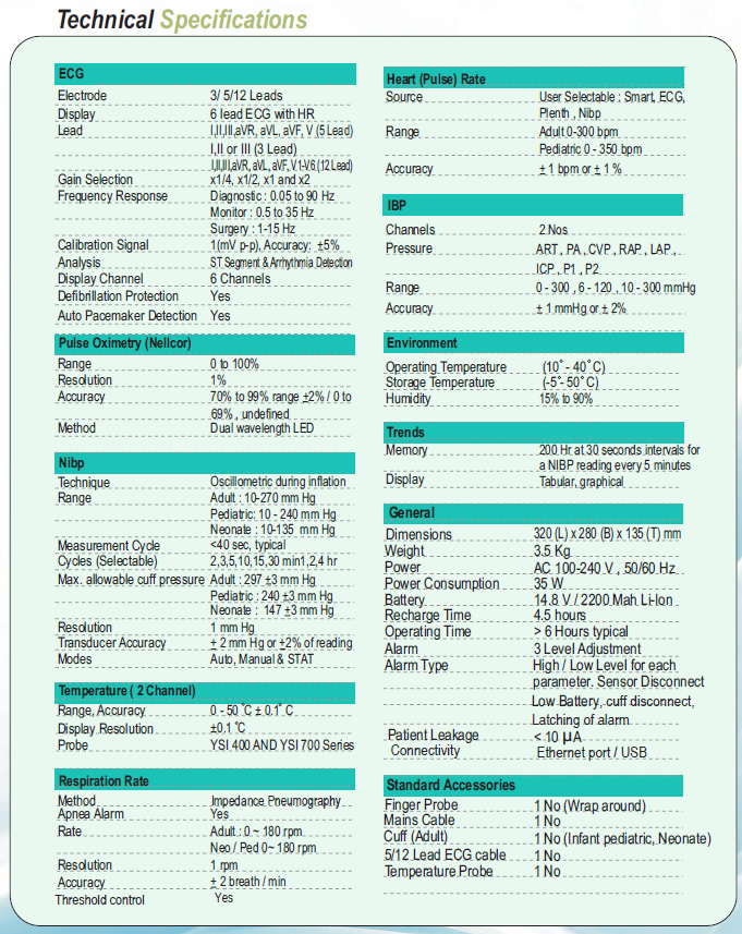| Standard parameters: 3/5/12 Lead ECG, SPO2, Nibp, 2-Temp,Optional parameters:- EtCo2, 2 IBP Thermal Recorder & wall installation |